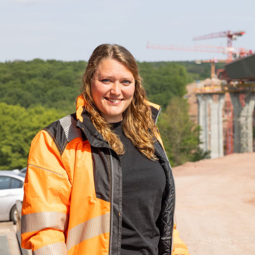 Die 28-Jährige ist Bauingenieurin bei der Firma Donges SteelTec. Sie ist auf dieser riesigen Baustelle im bayerischen Oberthulba verantwortlich für die Organisation der Montage des gesamten Stahlbrückentragwerks. Der erste Teil der neuen Brücke ist bereits fertig und lässt den Verkehr in beide Richtungen rollen. Metallträger an Metallträger bilden das Grundgerüst für die zweite Fahrbahn: 460 Meter lang und auf Pfeilern, die teilweise über 50 Meter Höhe erreichen.