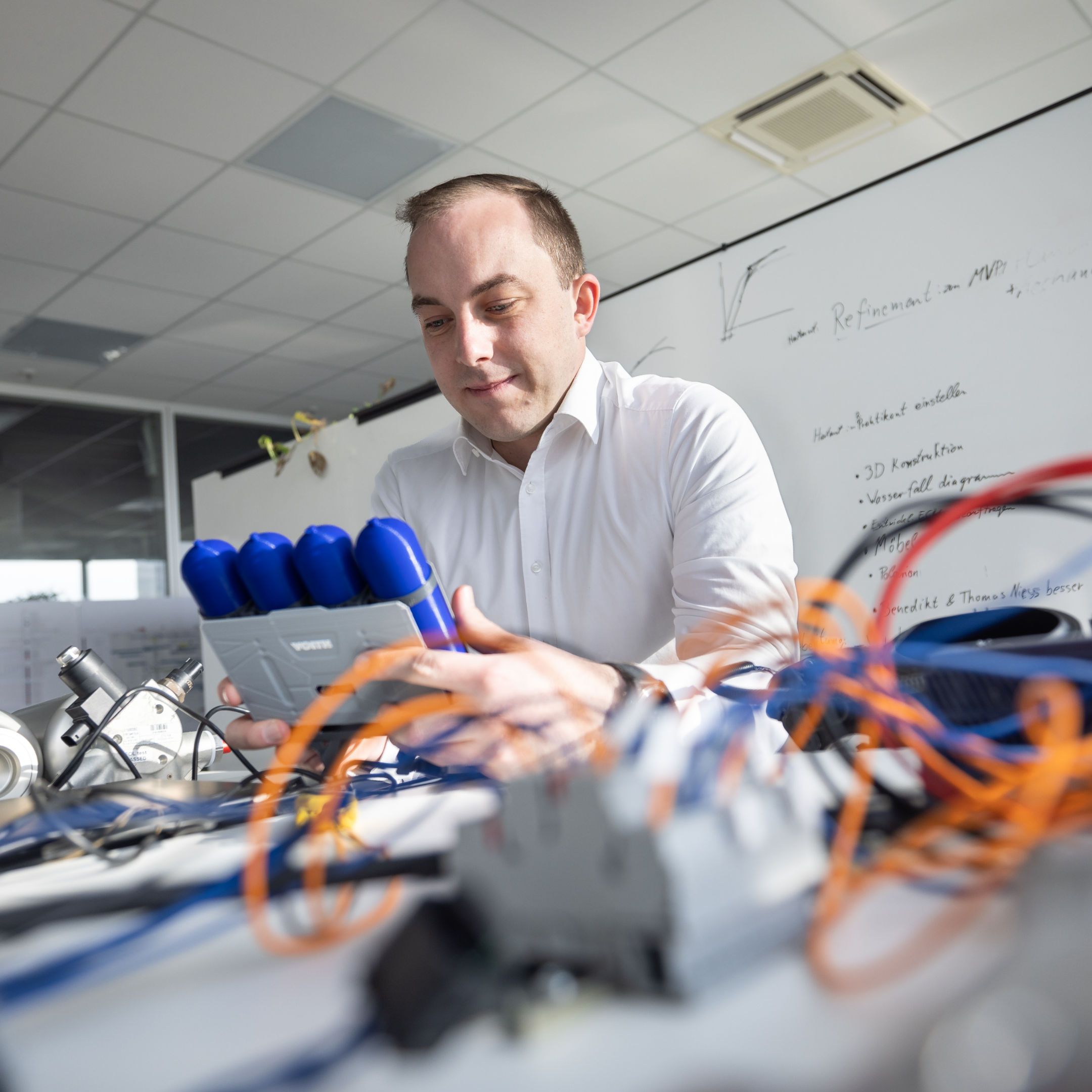 Voith beschäftigt weltweit über 21.000 Mitarbeitende an über 60 Standorten. Gegründet wurde der Technologiekonzern 35 Kilometer nördlich von Ulm in Heidenheim. Hier ist der Hauptsitz des Unternehmens, an dem Peter tätig ist. Nach seinem dualen Studium bei Voith hat er drei Jahre im Bereich Innovation und Technology gearbeitet. Nun wechselt er in das Projekt Wasserstoff. „Beim Prozess der Innovationsentwicklung steigen wir dann ein, wenn es darum geht, den Labormaßstab auf eine industrielle Größe zu skalieren, die wir wirtschaftlich am Markt anbieten können“, erklärt er. Und meint damit, dass er bei den Neuentwicklungen des Unternehmens mitüberlegt, ob und wie eine Entwicklung auch gewinnbringend vermarktet werden kann. „Ich habe als Wirtschafsingenieur unter den reinen Technolog*innen eher eine Doppelfunktion, da ich auch die wirtschaftlichen Ziele im Auge behalte“, erzählt er und muss lächeln. Es kann schon sein, dass er als Wirtschaftsingenieur im Maschinenbau und in der E-Technik eine Sonderrolle einnimmt. Aber eine, die sich später hoffentlich für das Unternehmen finanziell auszahlt.