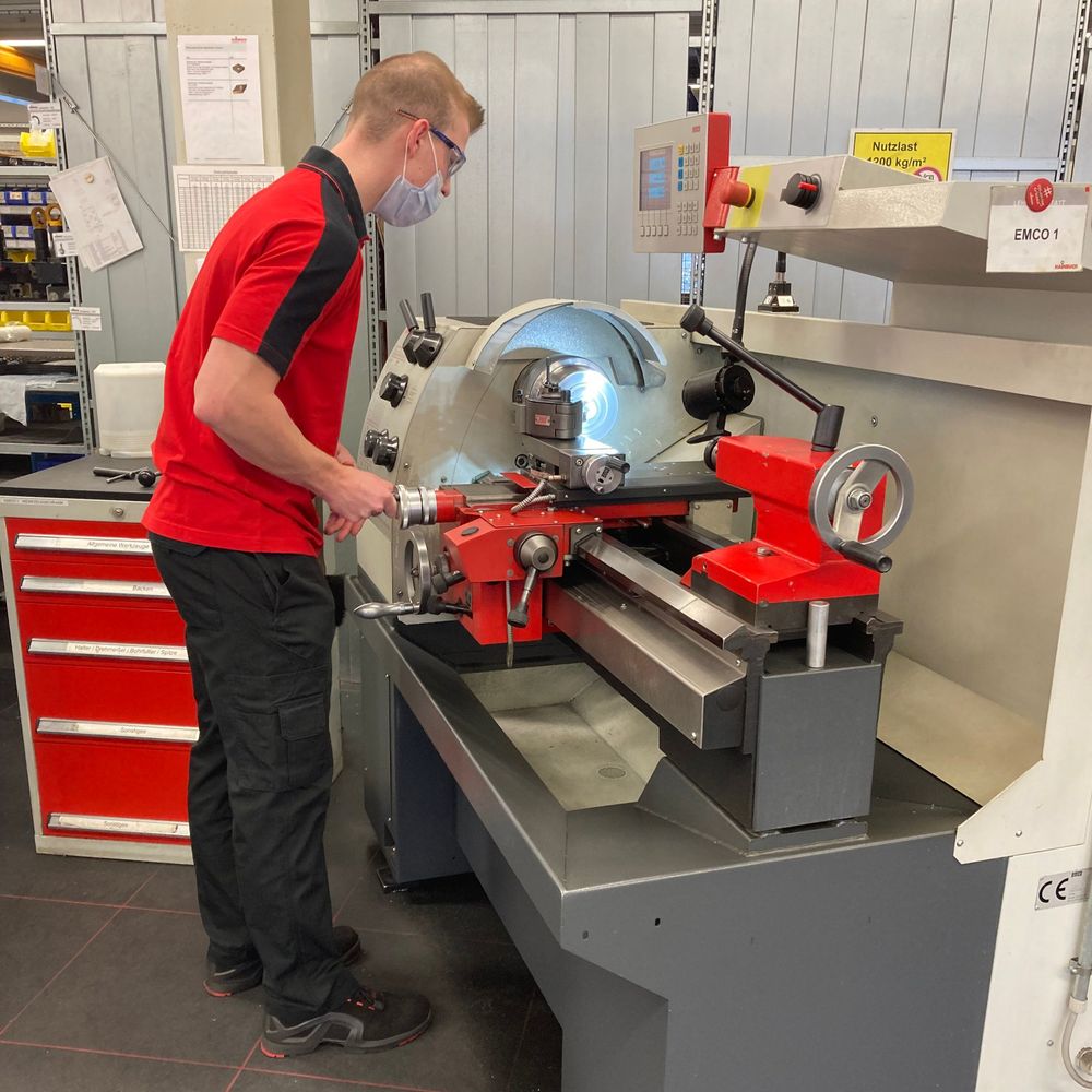 Bei Hainbuch dreht sich alles um Werkzeugmaschinen. Denn das Unternehmen stellt für die unterschiedlichen Maschinen, wie Dreh-, Fräs- und Schleifmaschinen, Spannmittel her. Kim beschäftigt sich momentan besonders mit der Drehmaschine und dem dazugehörigen Spannfutter. Klingt kompliziert, ist es aber gar nicht: „Das Spannfutter ist wie die Hand beim Schreiben. Die Hand hält den Stift fest und positioniert ihn, damit ich schreiben kann. Genauso hält das Spannfutter ein Werkstück fest, damit es in der Drehmaschine bearbeitet werden kann“, erklärt Kim. Die Bauart vom Spannfutter ist dabei ausschlaggebend, welche Qualität das Werkstück am Ende aufweist. Hält es mit zu wenig Kraft, dann vibriert das Werkstück beim Bearbeiten in der Drehmaschine und die Abtragung des Materials wird ungenau. Jede noch so kleine Abweichung - selbst wenn es nur eine halbe Haaresbreite ist - führt am Ende dazu, dass sich ein Werkstück nicht passgenau in das Gesamtsystem der Maschine einfügt.