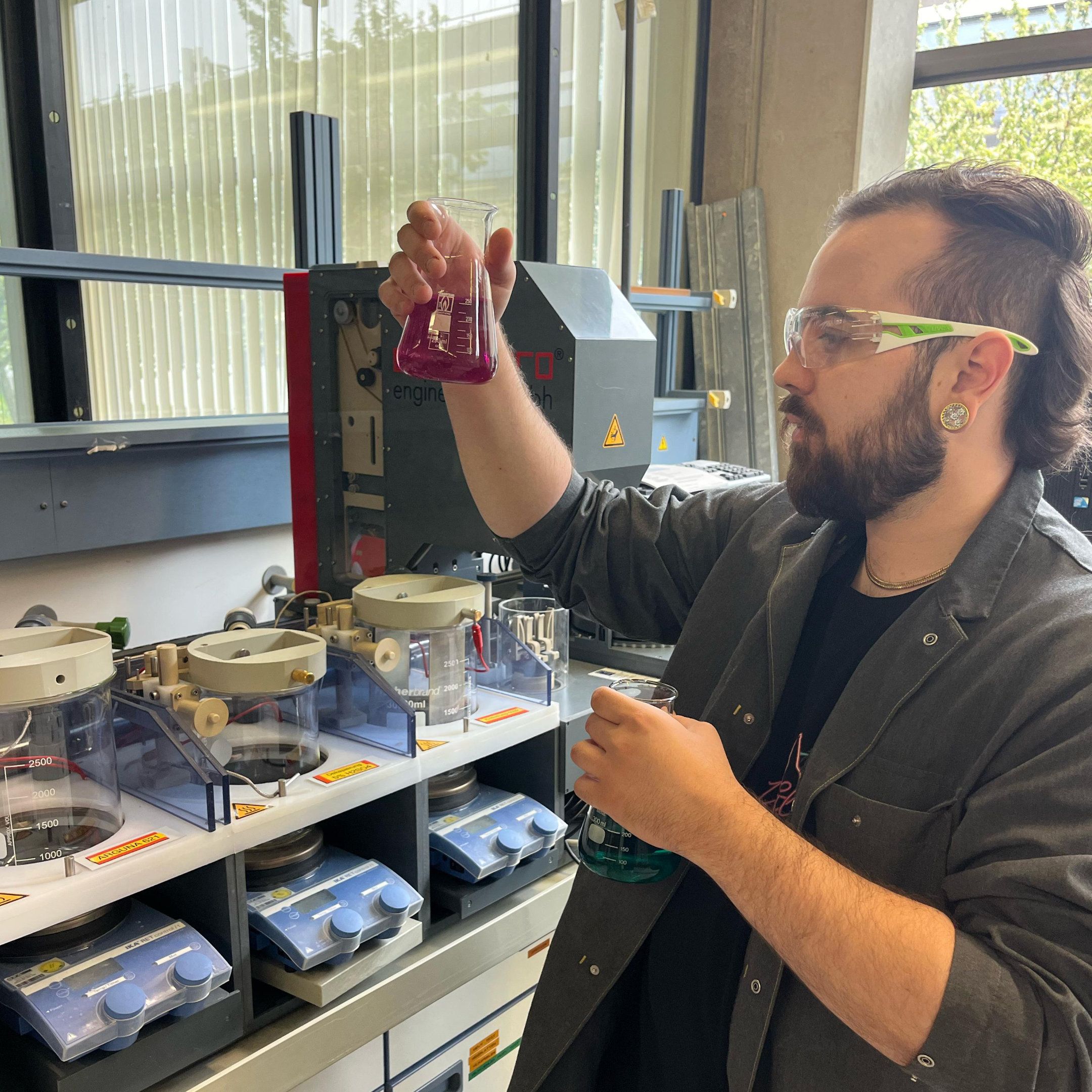 Andere ingenieurwissenschaftliche Studiengänge mit hohem Chemieanteil wären Verfahrenstechnik und Chemieingenieurwesen, doch Luis hat sich bewusst für Oberflächentechnologie entschieden: „Diese Branche ist eine extreme Nische, da ist es von Vorteil, wenn man sich von Anfang an spezialisiert, um als absoluter Experte aus dem Studium herauszugehen. Das ist es, was die Industrie dringend braucht.“ Der Studienplan hält unter anderem ein sechsmonatiges Praxissemester bereit. „Hier konnte ich an Herausforderungen arbeiten, die es in der Industrie wirklich gibt. Das hat richtig Spaß gemacht und gezeigt, wofür ich den ganzen Stoff in den Vorlesungen gelernt habe.“