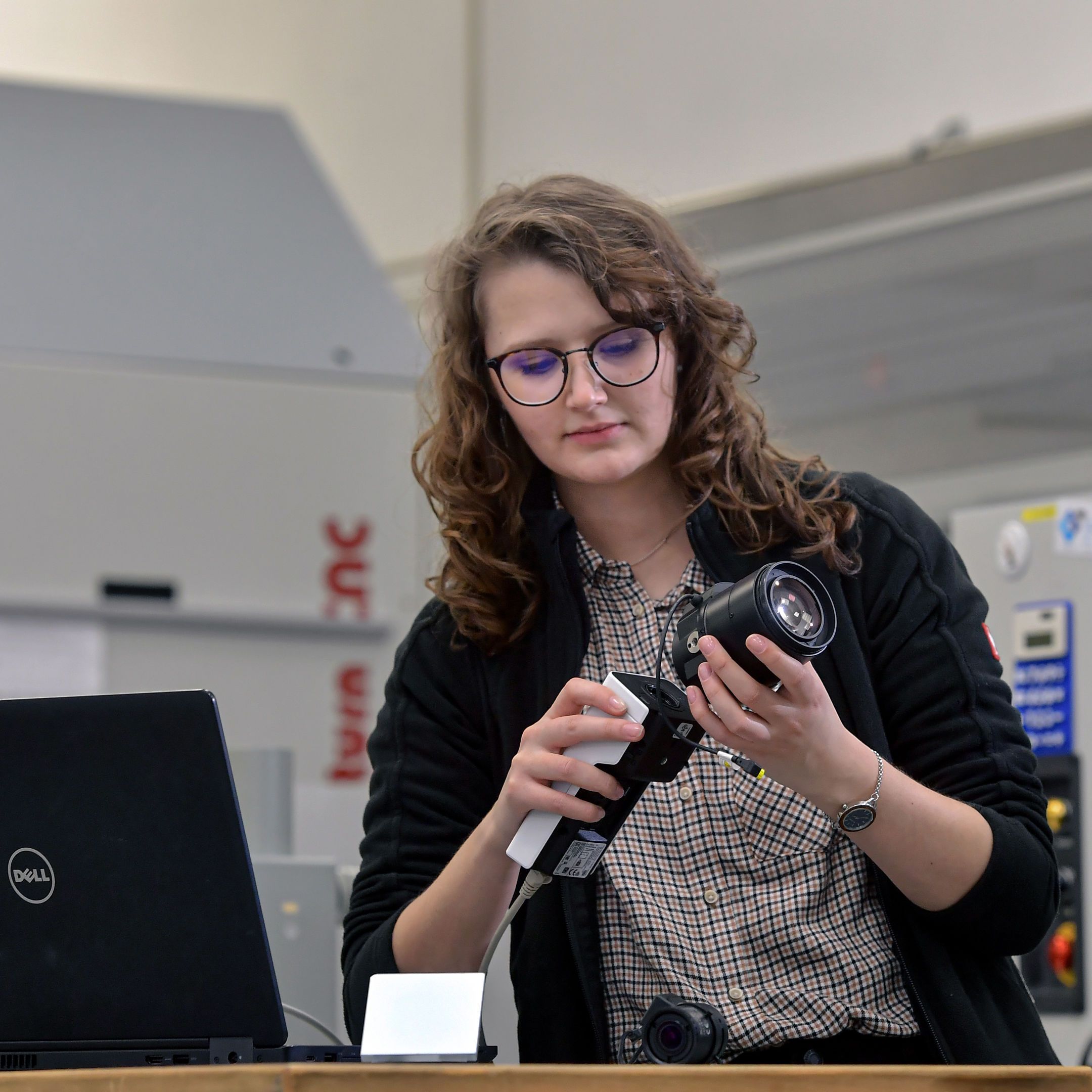 Gesagt, getan: In einer ihrer Projektarbeiten baut die 26-Jährige ein Kameraüberwachungssystem für den Maschineninnenraum einer Drehmaschine. Dieses sollte eigentlich die Arbeitsprozesse überwachen, um sie anschließend automatisieren zu können. Doch als es zu einem unvorhergesehenen Fehler kam, konnte sich das Projekt bereits vorher bewähren: „Als ich die Kamera in einem längeren Test betrieben habe, ergab sich direkt ein Anwendungsfall. Die Maschine ist wegen eines Fehlers während des automatischen Betriebs stehen geblieben und wir konnten mit Hilfe der Kamera die Ursache für den Fehler finden. Das war für mich ein echtes Erfolgserlebnis.“